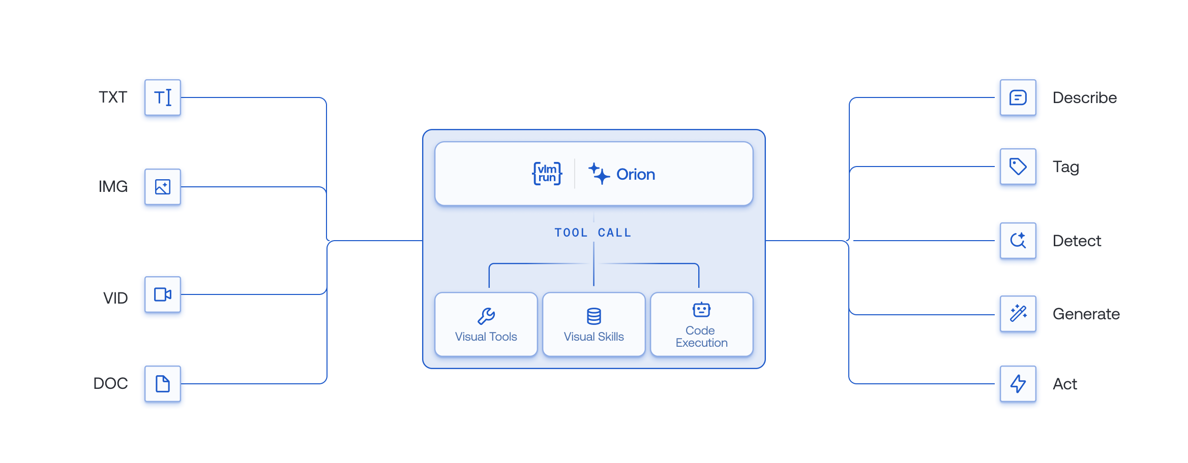 vlmrun-orion-1 orchestrates specialized computer vision tools – OCR, detection, segmentation, keypoint localization, diffusion, and geometric analysis – to execute complex multi-step visual workflows from natural language instructions. This marks the transition from passive visual understanding to autonomous, tool-augmented visual intelligence that bridges neural perception with symbolic execution.